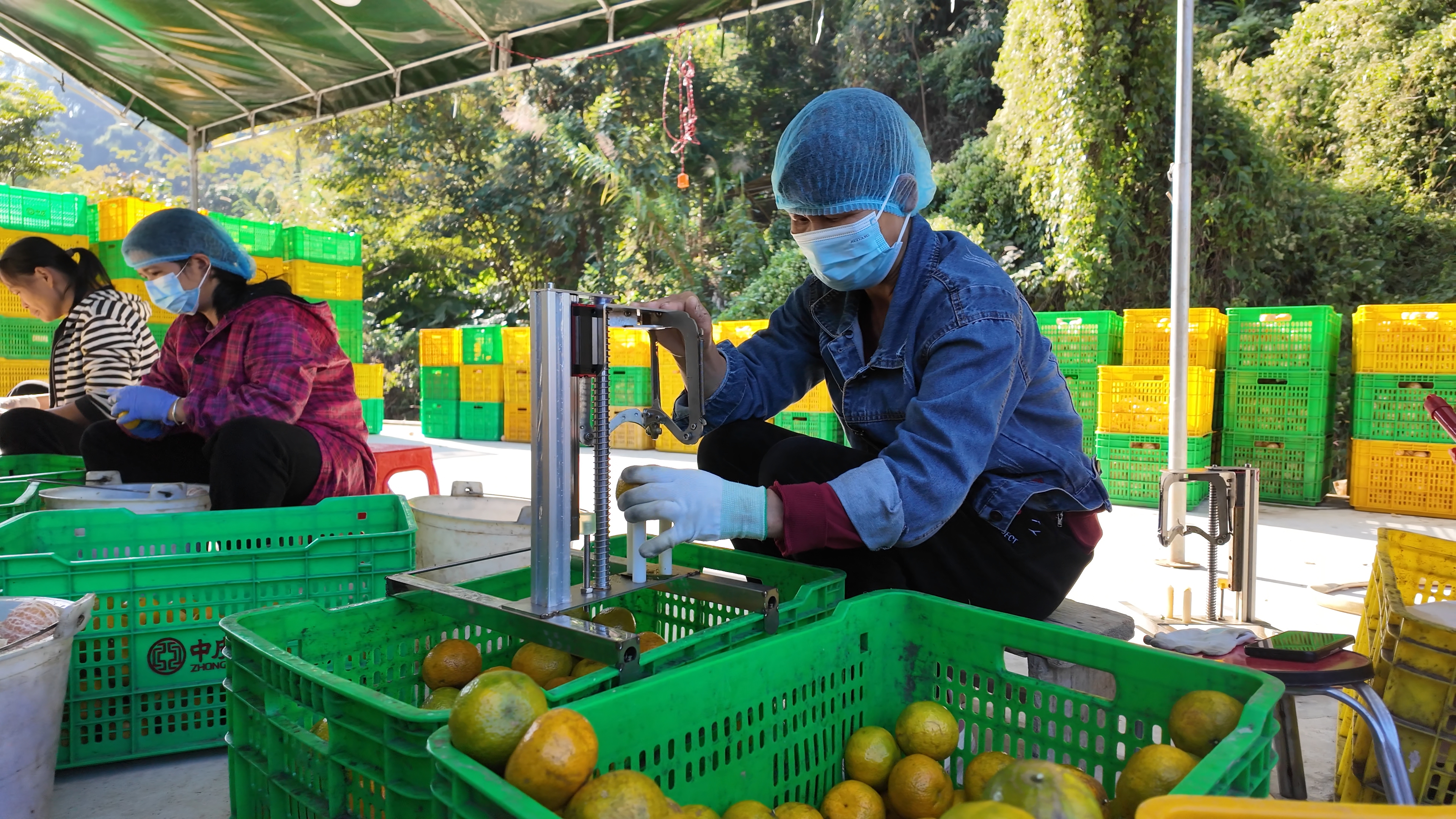 工人们正在对今年首批采摘的大红柑进行开皮。