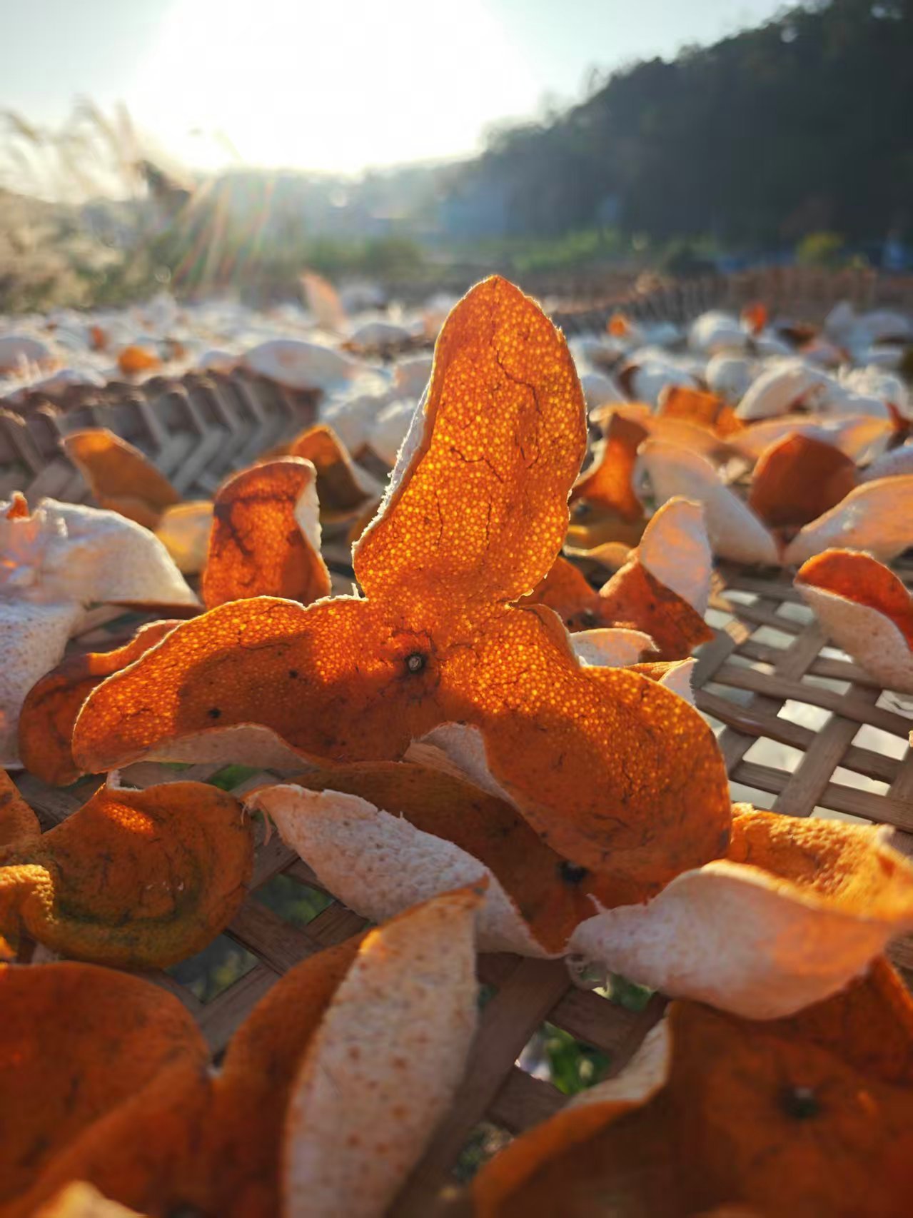 “现在这些小陈皮就是我们的‘金饭碗’。”一位正在翻皮的工人笑着说道。她身后,一筐筐鲜果整齐排列,等待进入下一道工序。三冠陈皮相关负责人介绍,过去浦北陈皮多以家庭作坊式为主,缺乏统一标准,产品质量参差不齐。如今,产业园引入了先进的加工设备和工艺,从清洗、开皮到晾晒、陈化,每一道工序都有严格的标准和规范,确保了陈皮品质的稳定性和一致性。